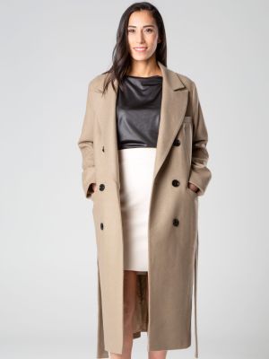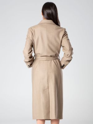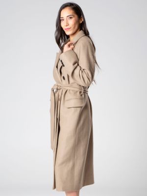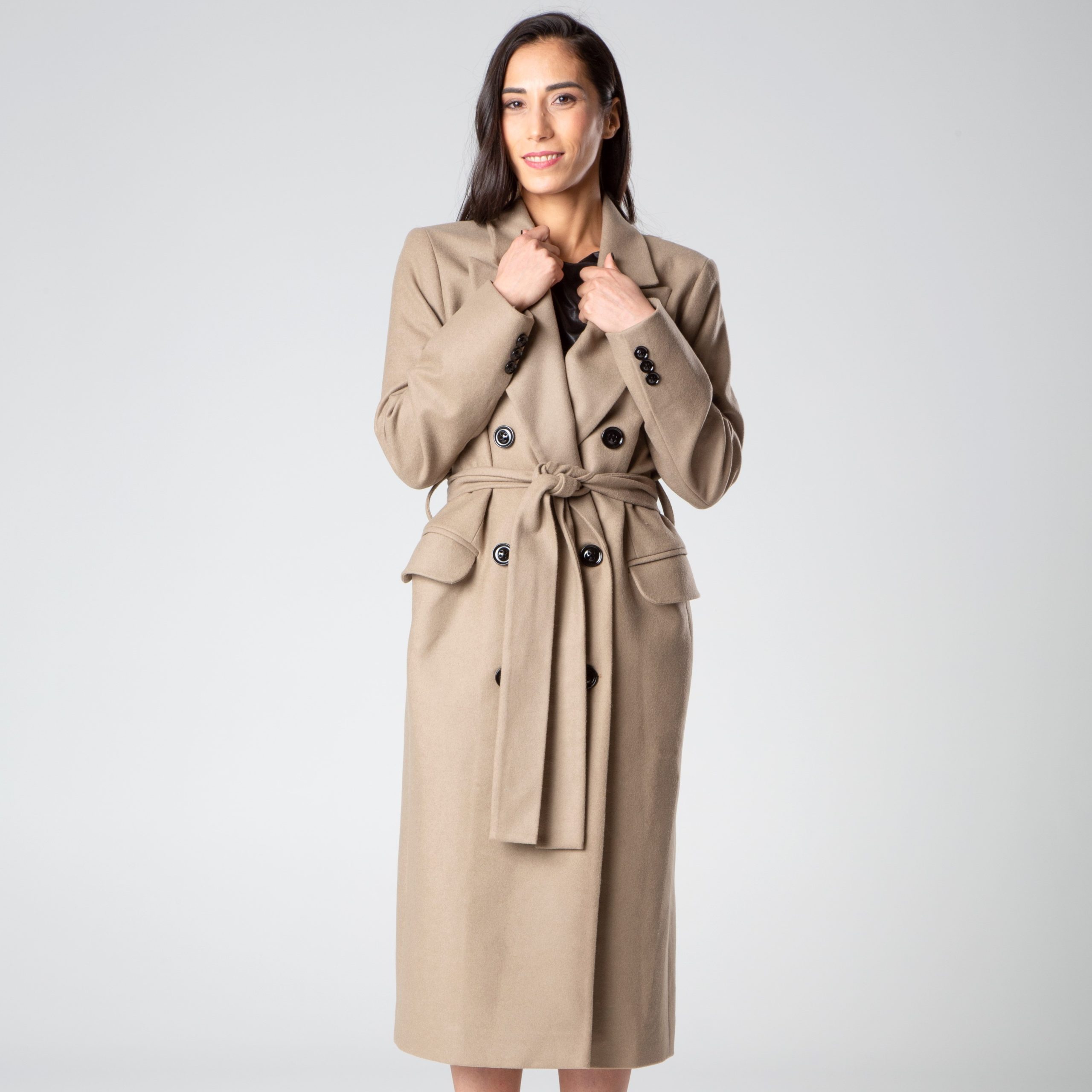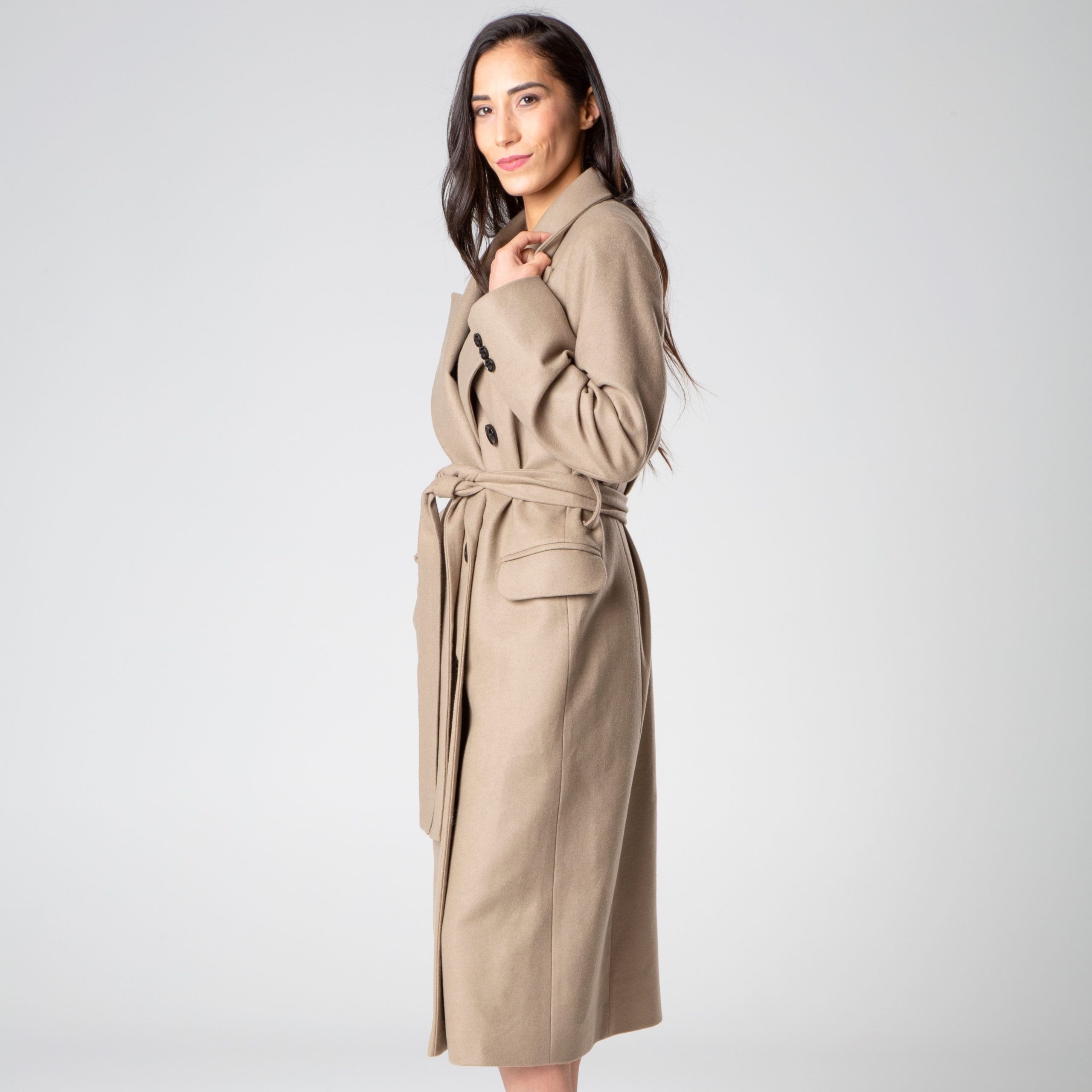 Cappotto in lana mista, foderato, con ampi revers, cintura che si annoda, manica lunga, tasche anteriori a pattina realizzato da Şotropa.