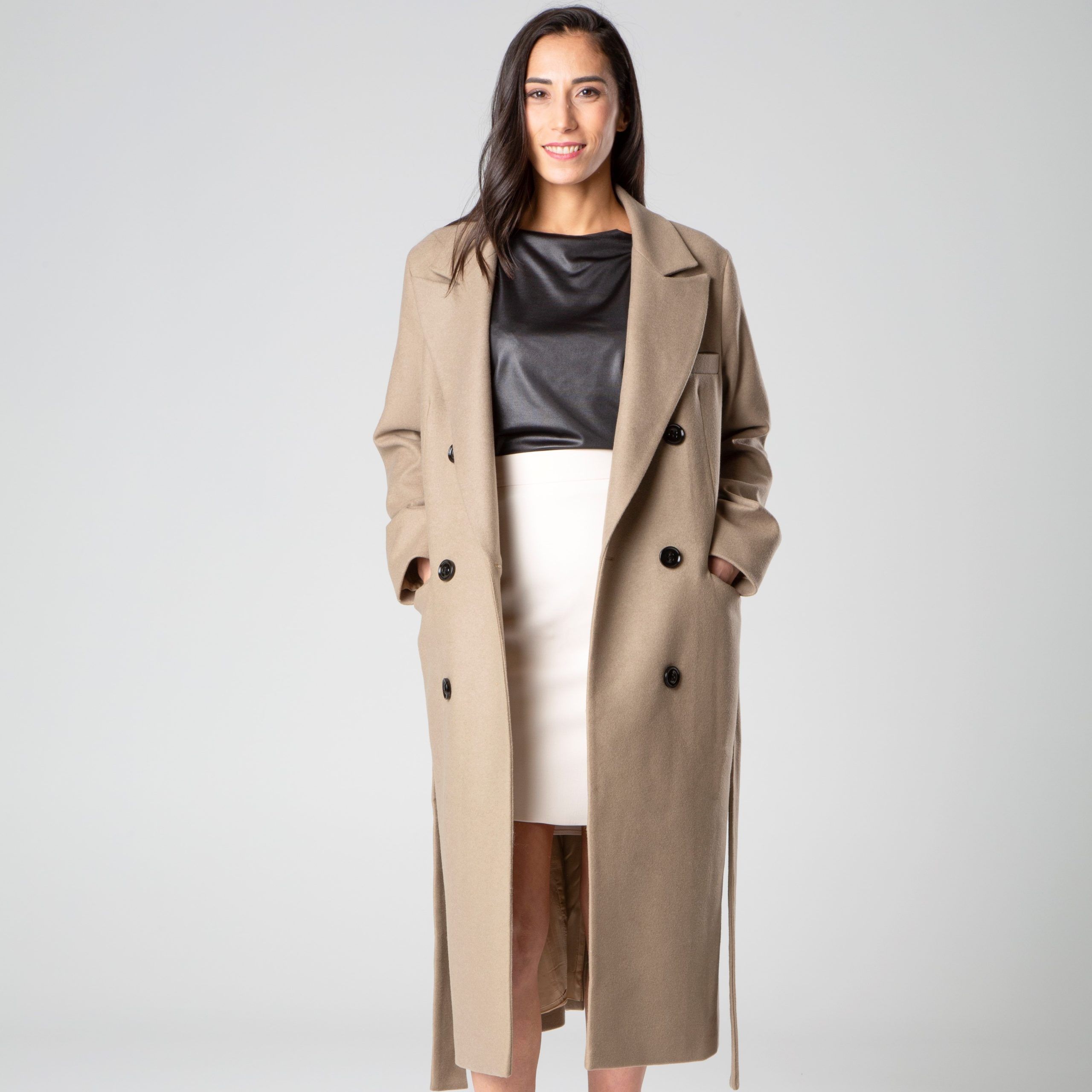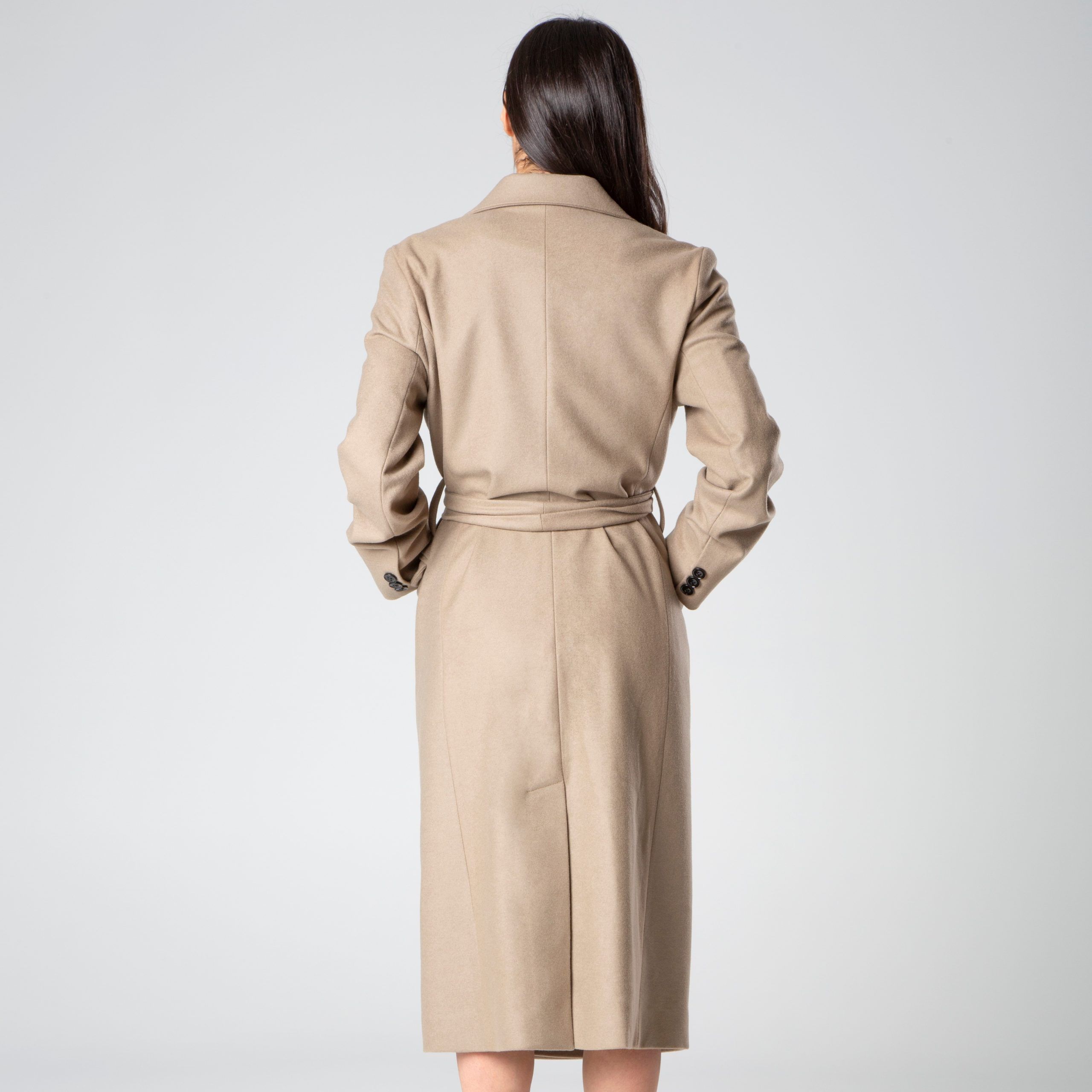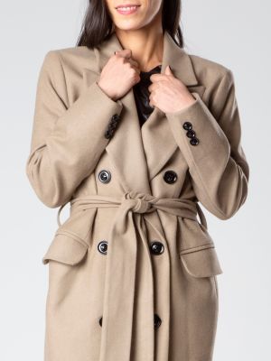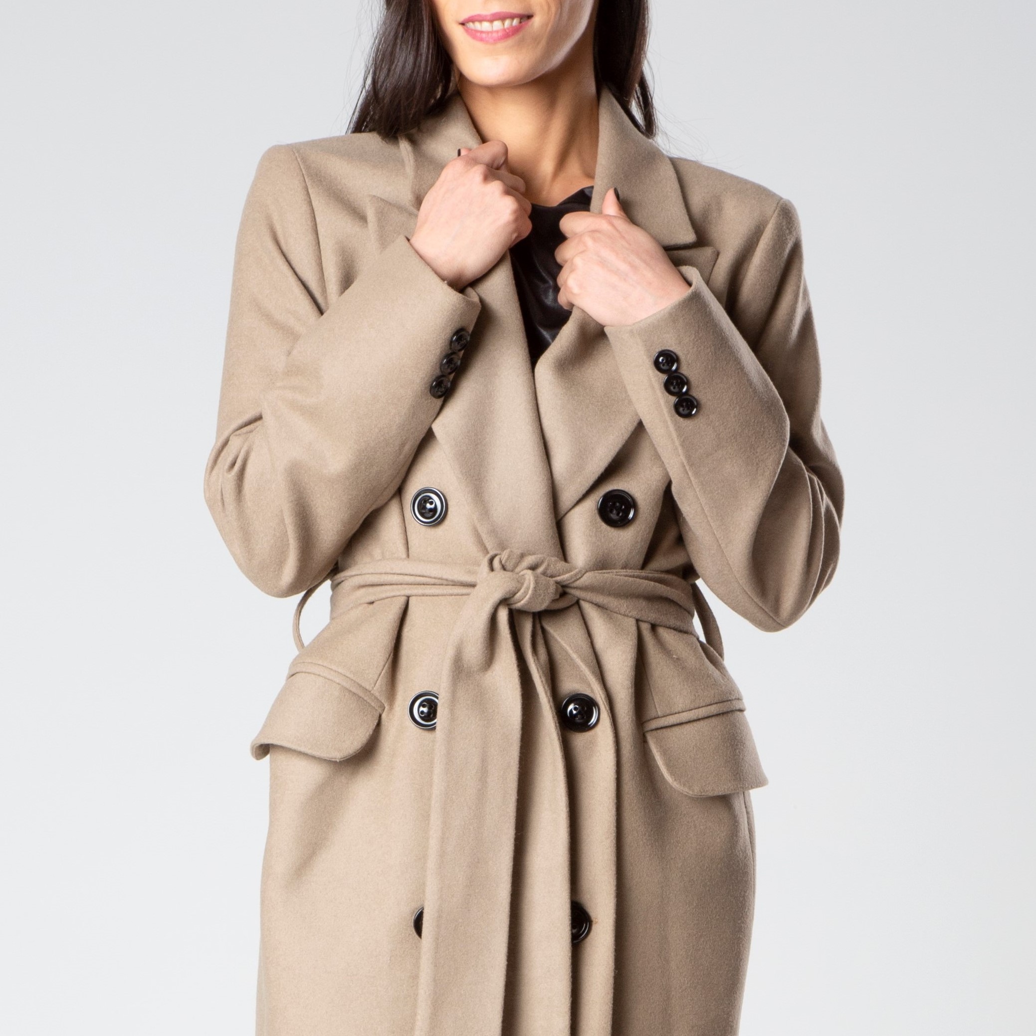 Cappotto in lana mista, foderato, con ampi revers, cintura che si annoda, manica lunga, tasche anteriori a pattina realizzato da Şotropa.