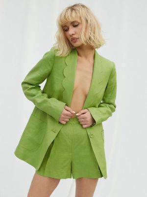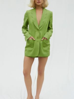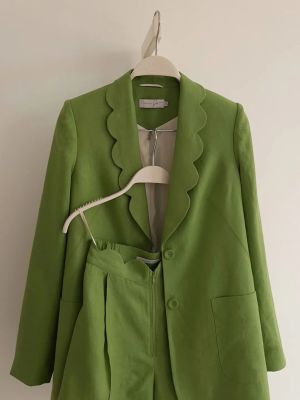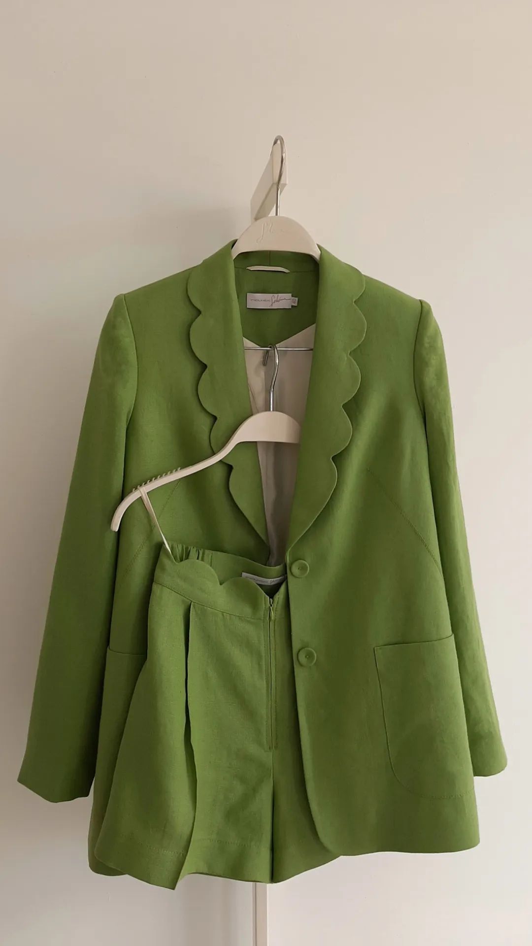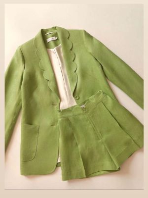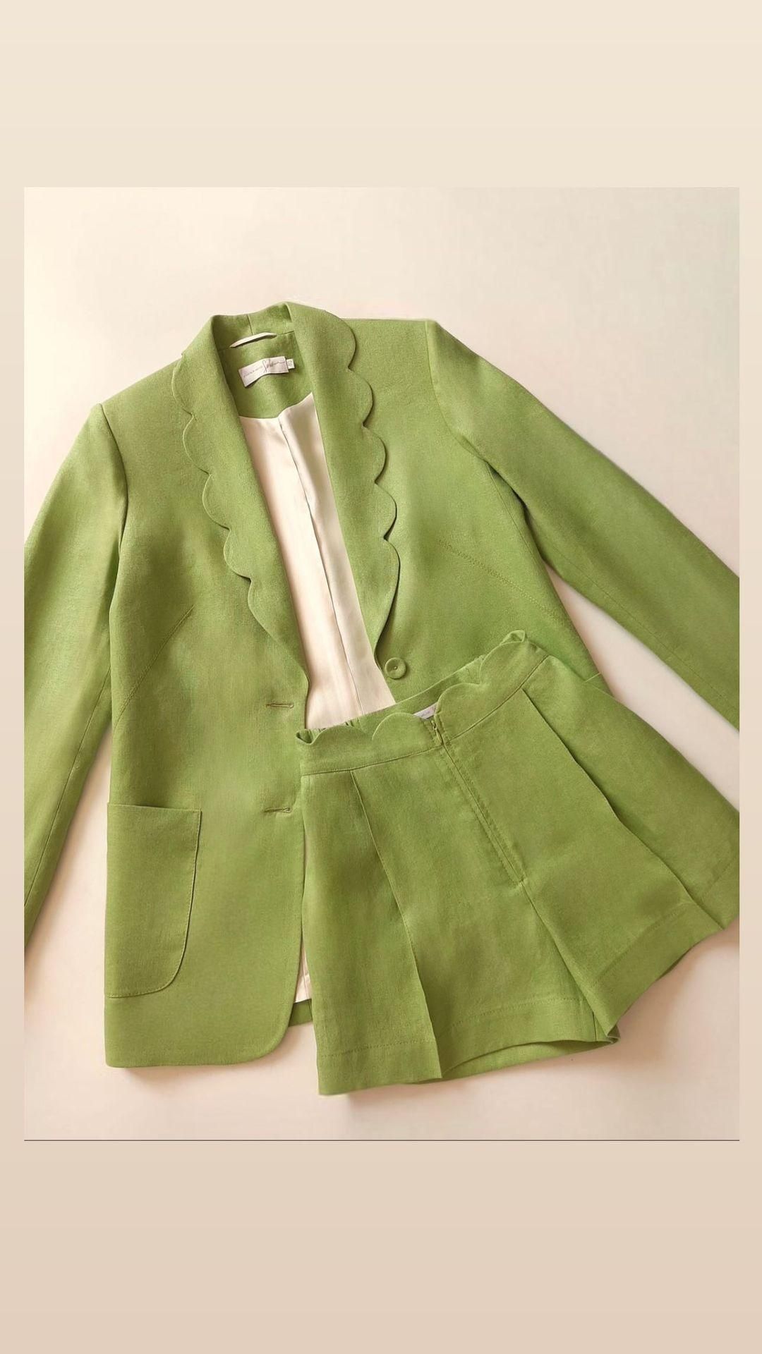 Giacca monopetto con tasche a patta e maniche lunghe. Pantalone corto elegante con due tasche laterali.