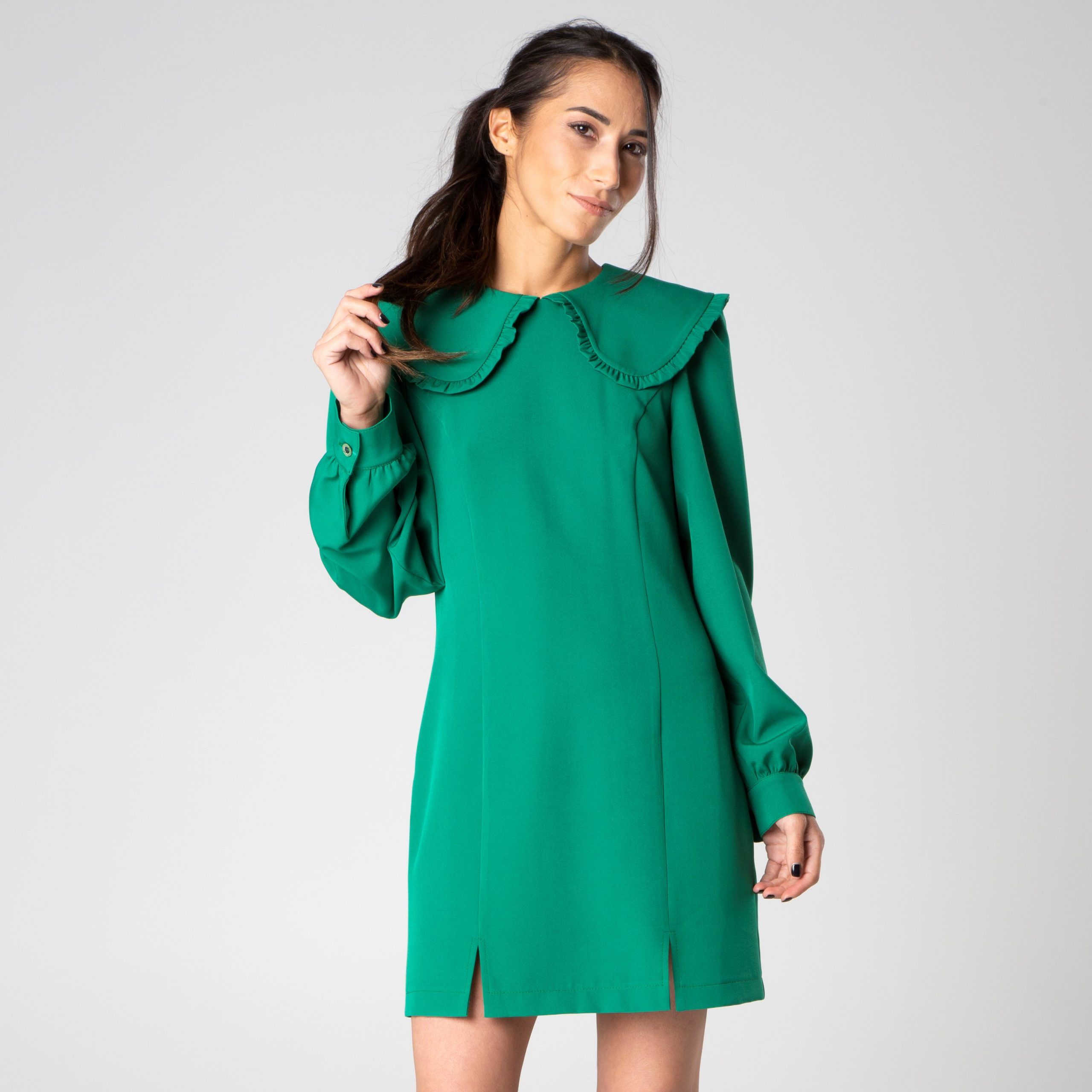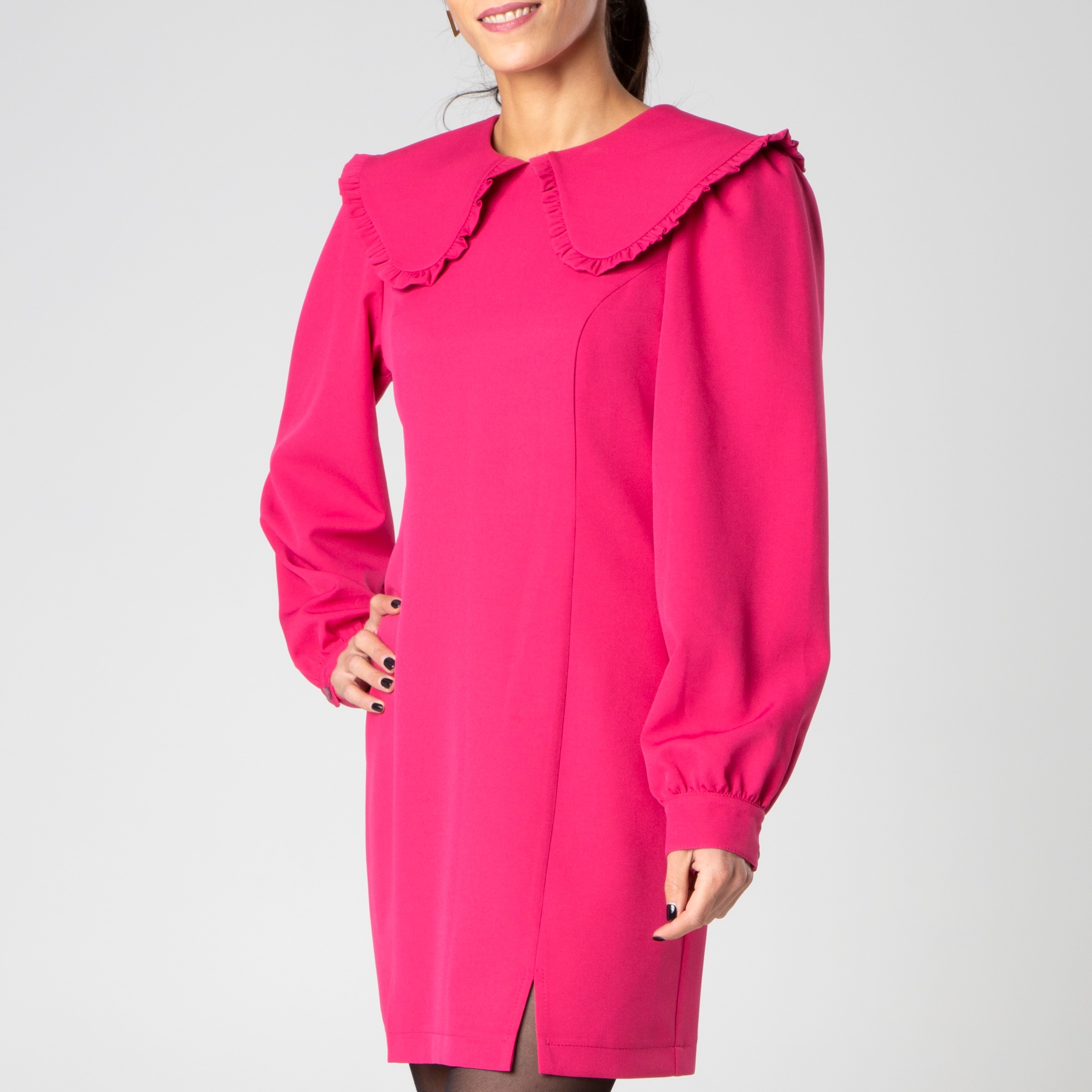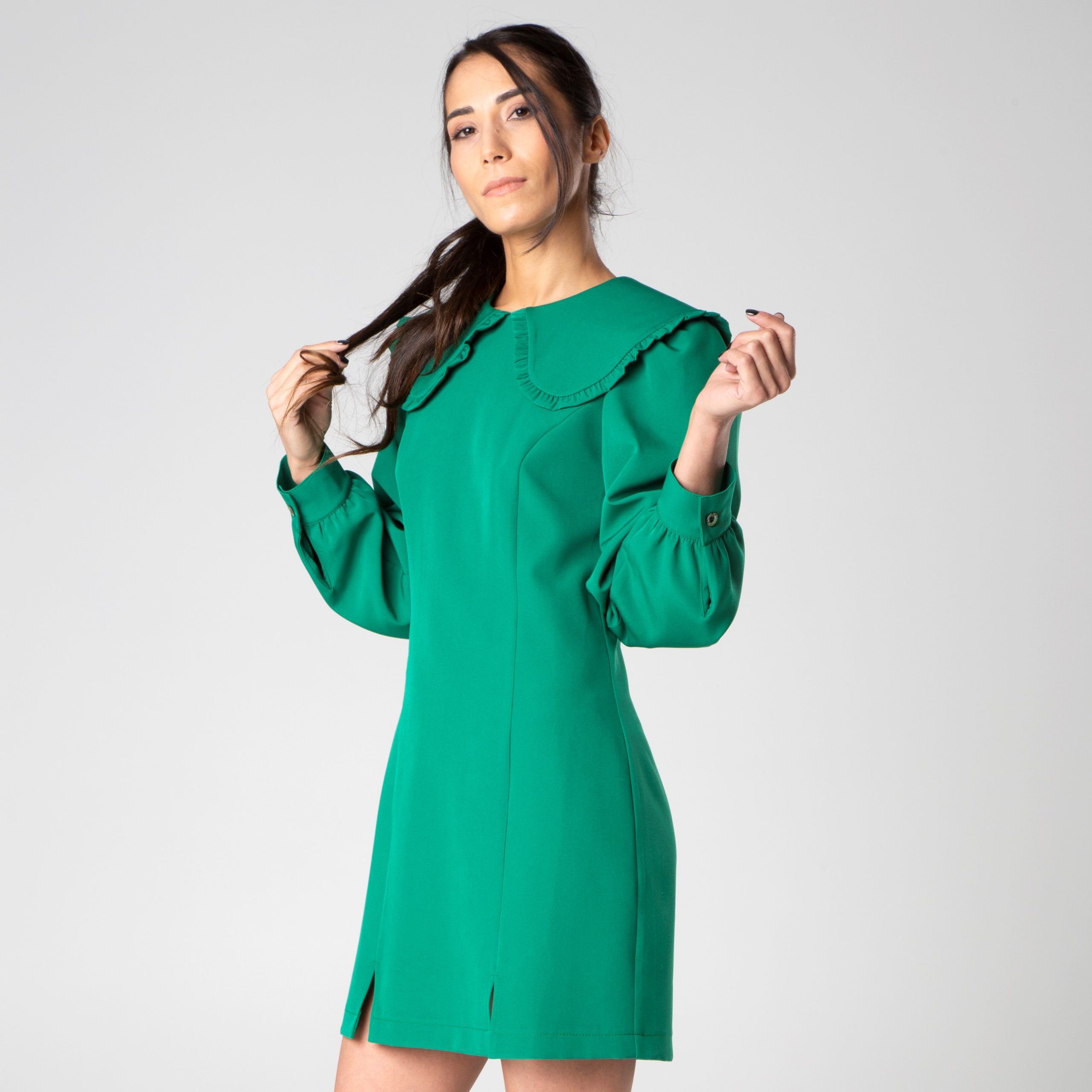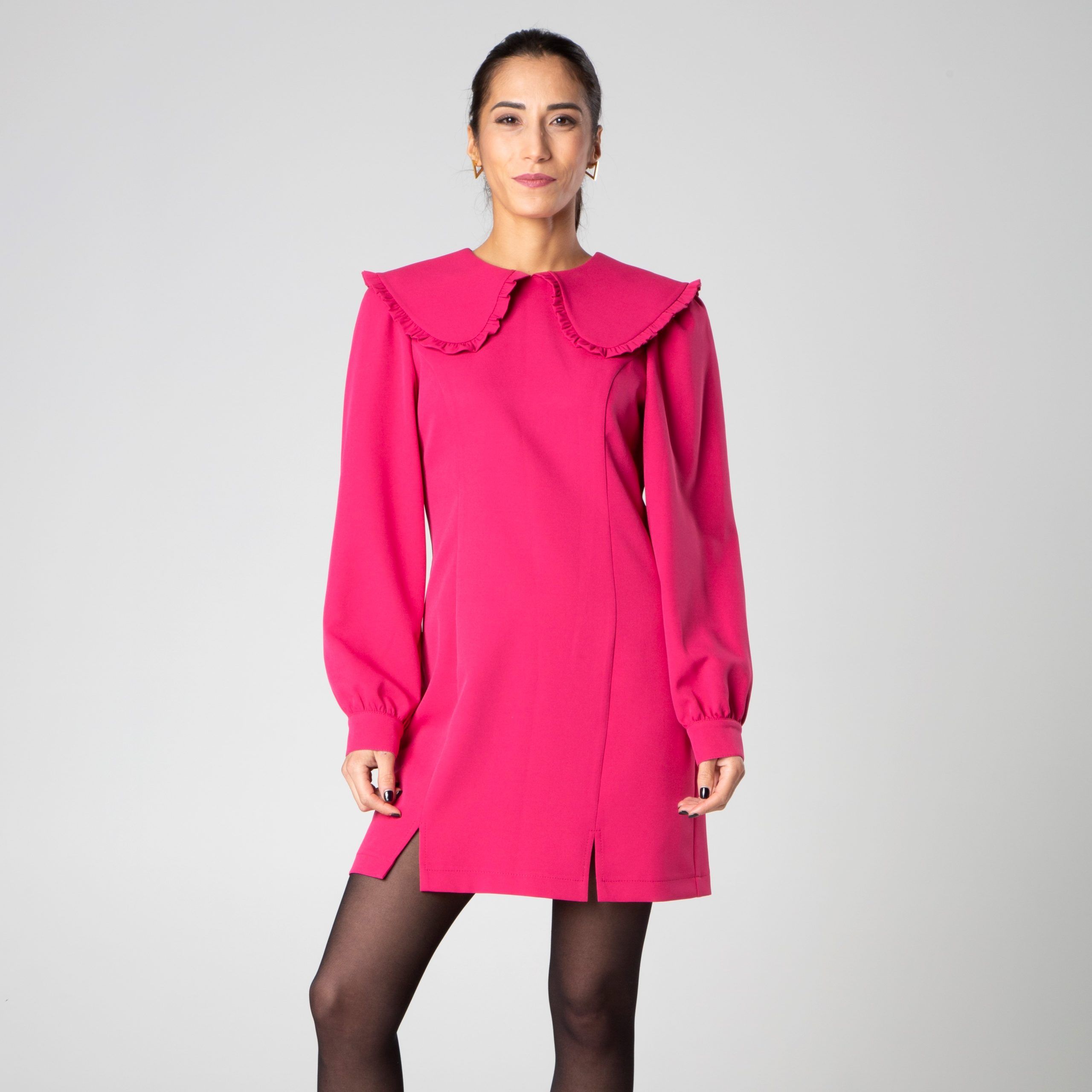 Miniabito con colletto retro e maniche lunghe a sbuffo con polsino realizzato da Sotropa. Leggermente ripreso in vita e con spacchi laterali.