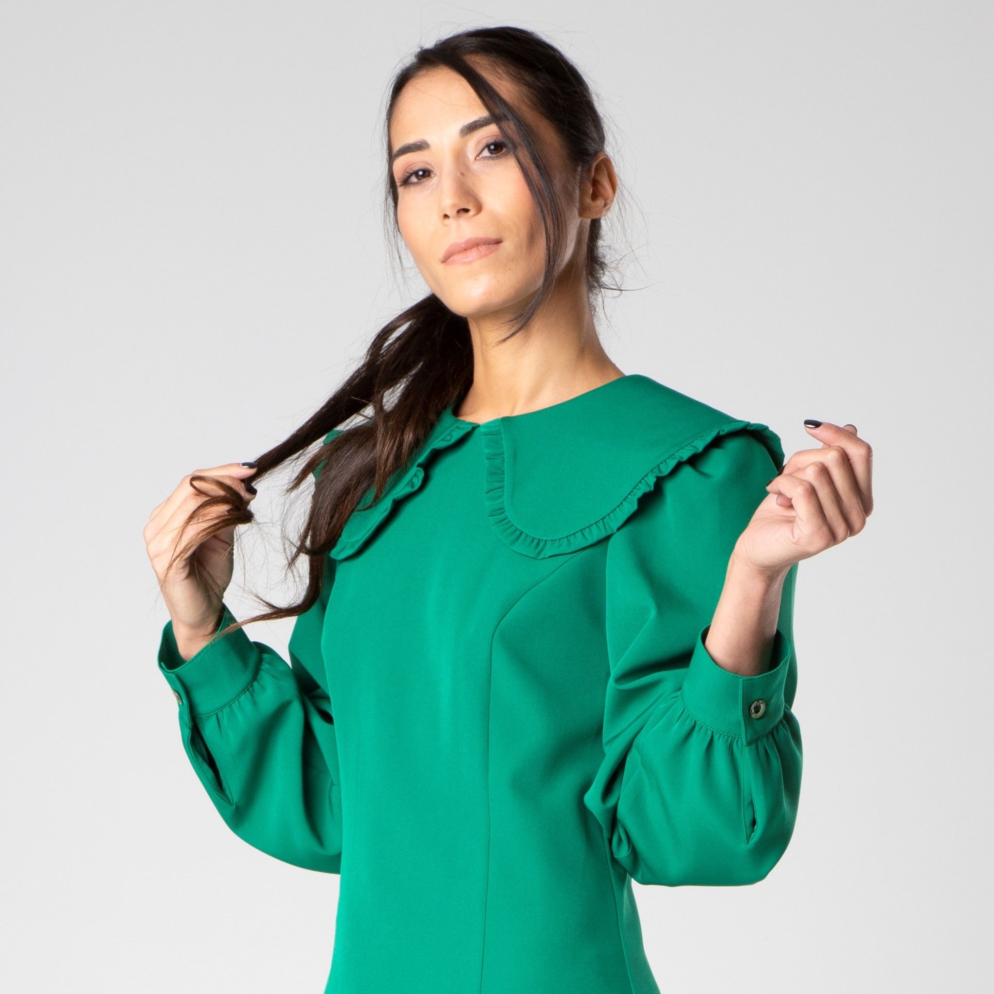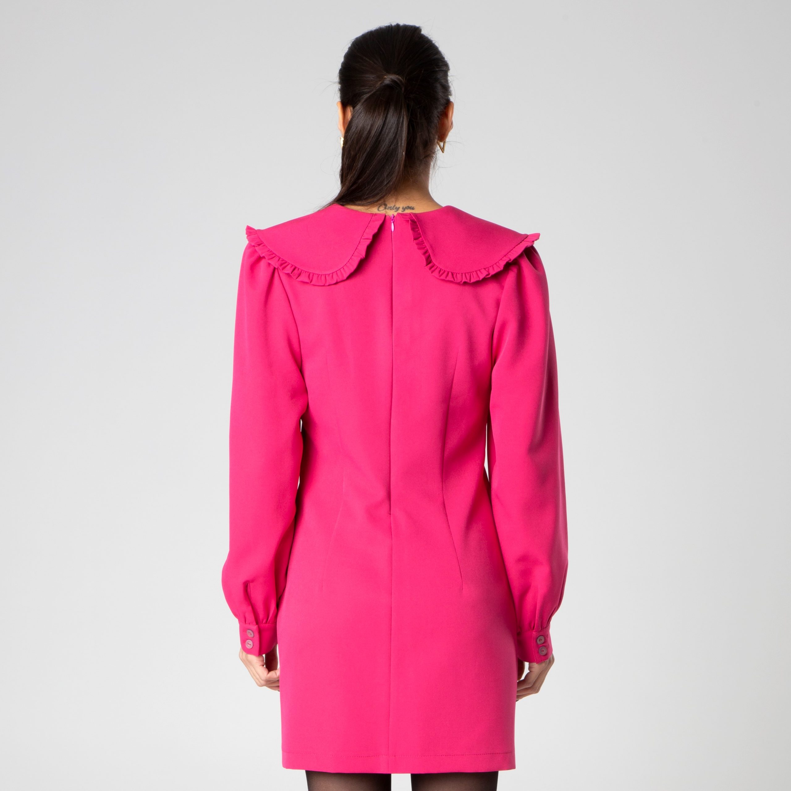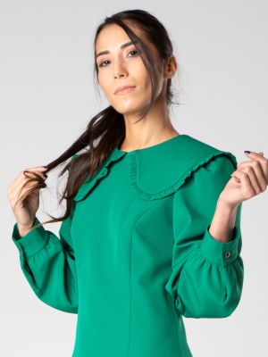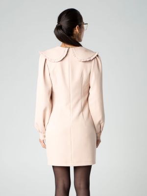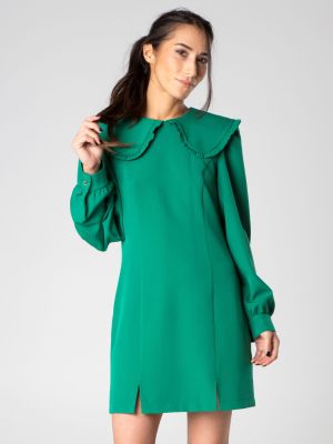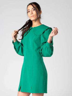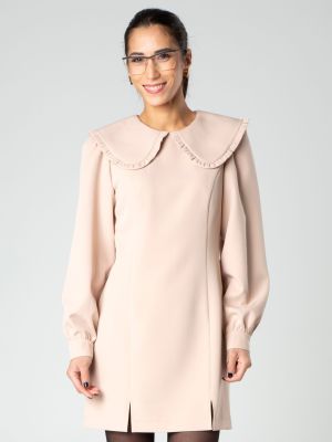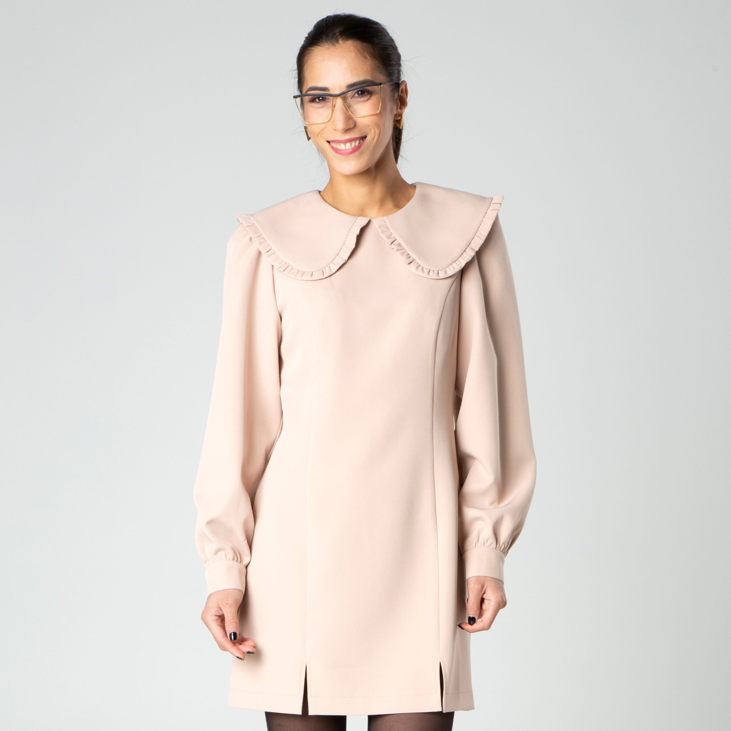 Miniabito con colletto retro e maniche lunghe a sbuffo con polsino realizzato da Sotropa. Leggermente ripreso in vita e con spacchi laterali.