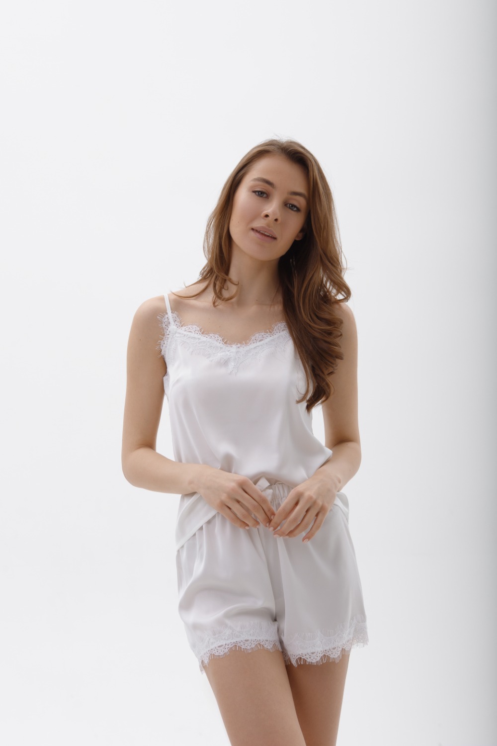 Pigiama con pantaloncino corto e top con spalline sottili regolabili, rifiniti con pizzo francese.