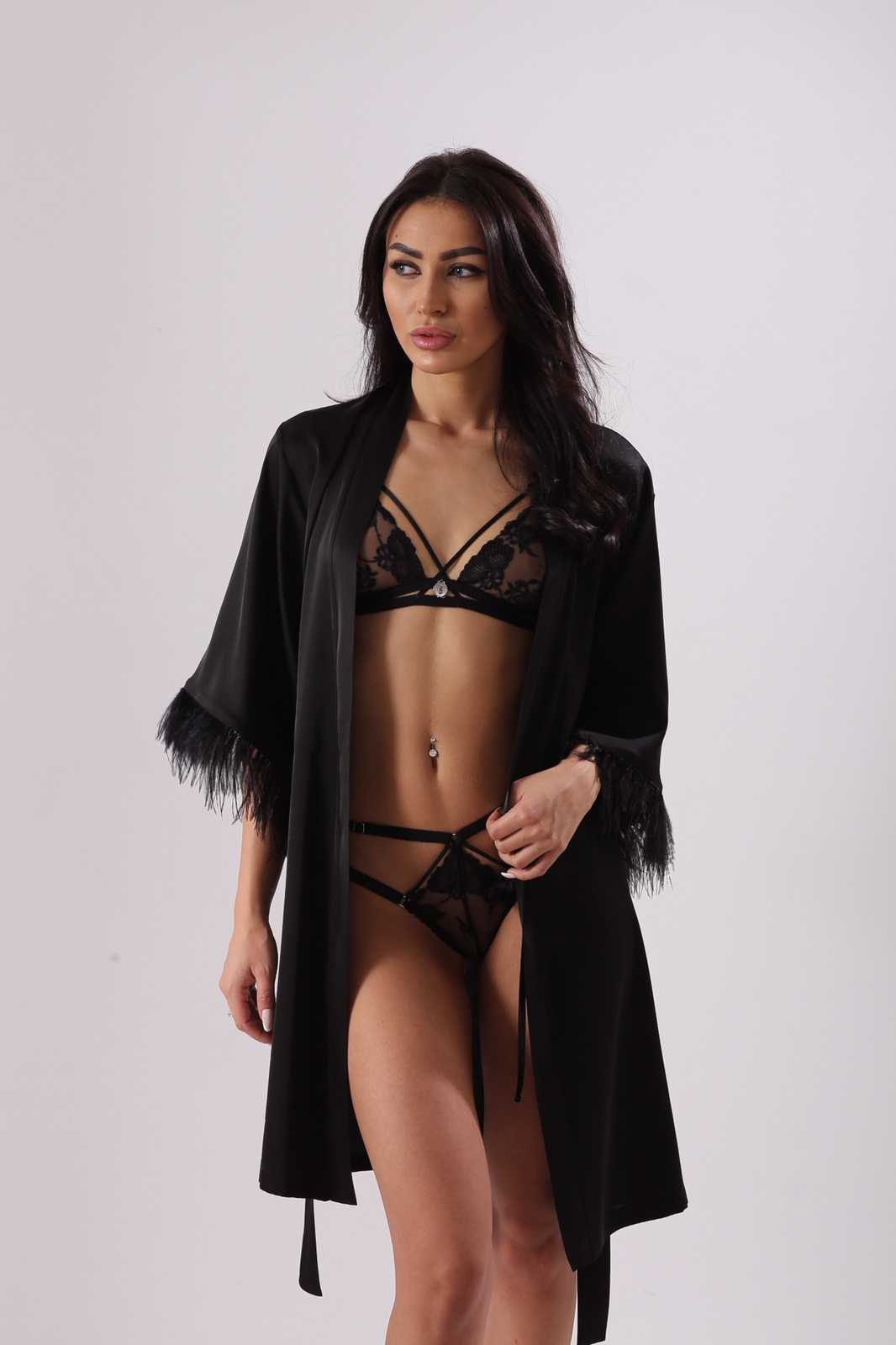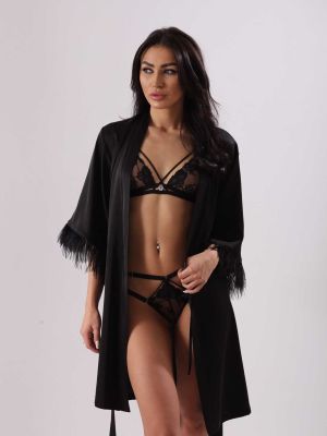 Vestaglia con piume interamente in seta, punto vita con cinta e maniche lunghe.